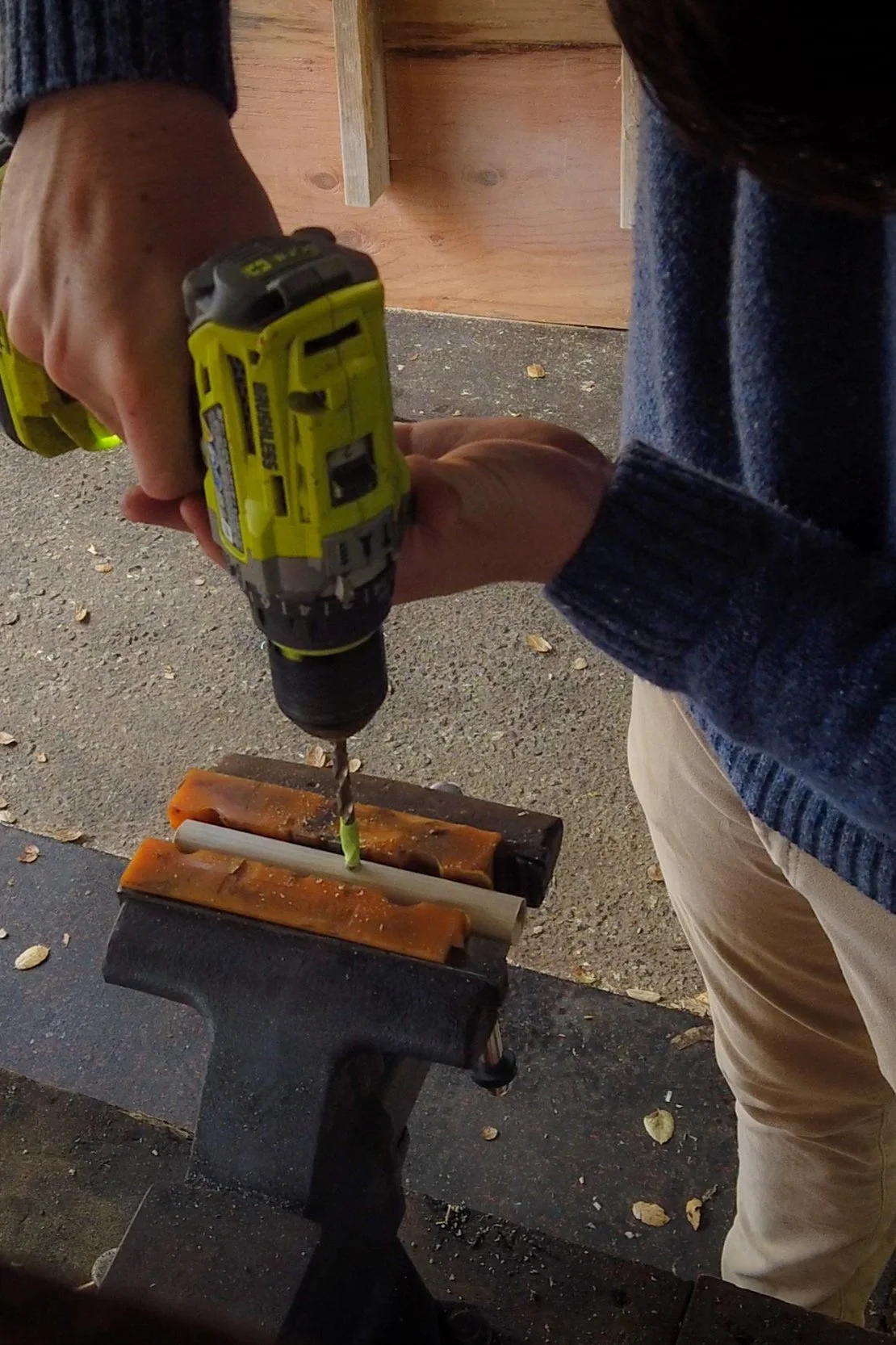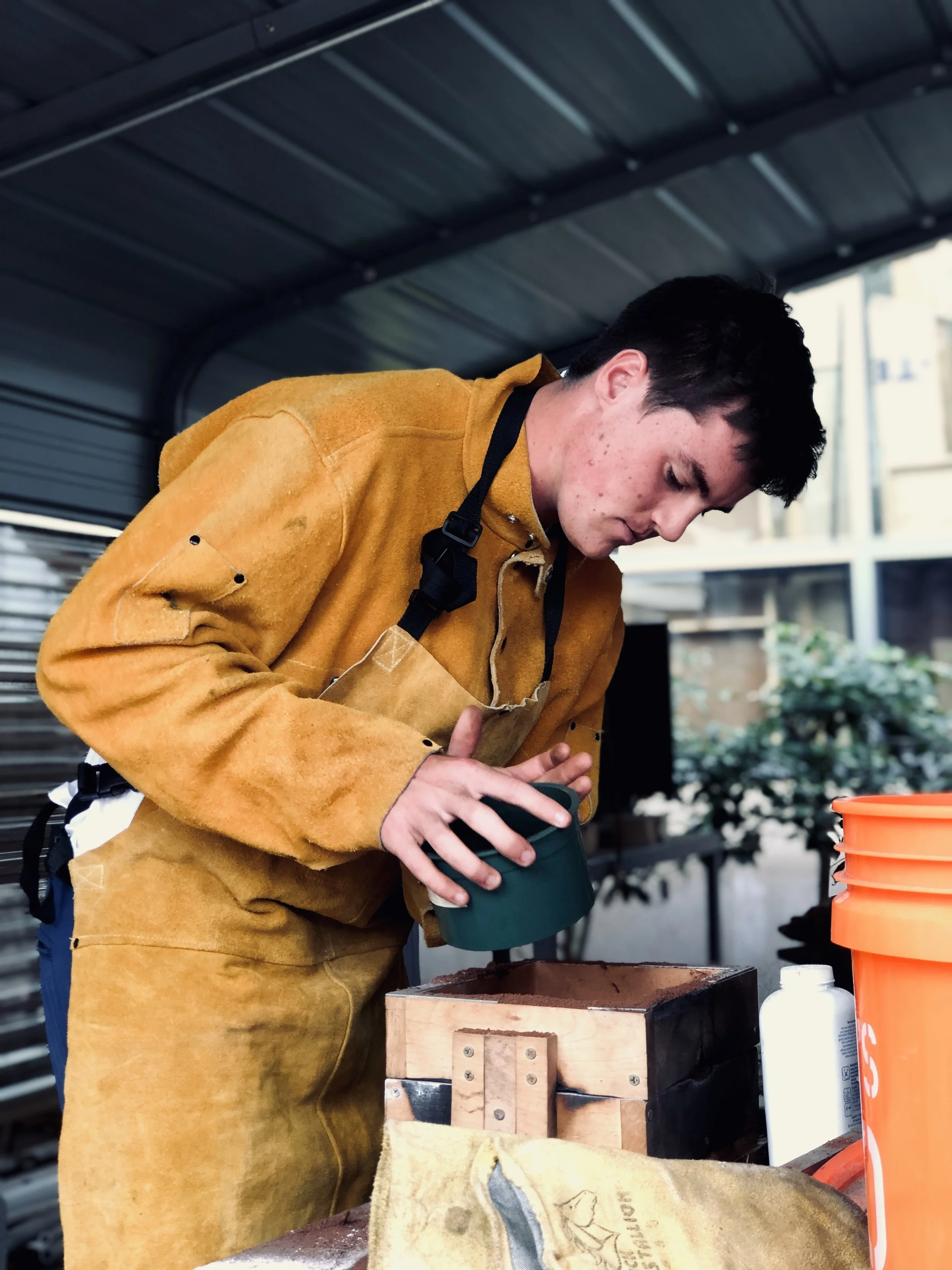 Polished and finished with a blue patina, then custom stamped and and painted.